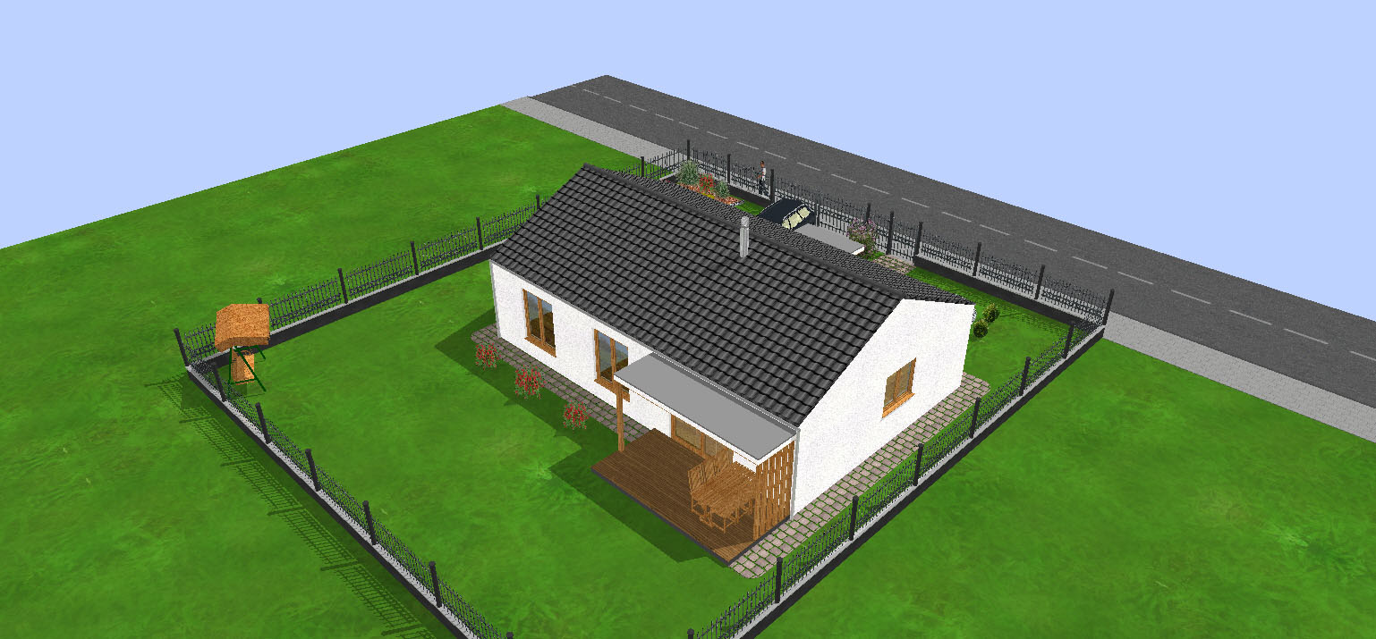 Na relatívne malej zastavanej ploche iba 104 m2 (94 m2 úžitkovej plochy) je všetko, čo potrebujete - 3 spálne, priestranná obývačka s kuchyňou, jedálňou, krbom a francúzskym oknom ústiacim na terasu.